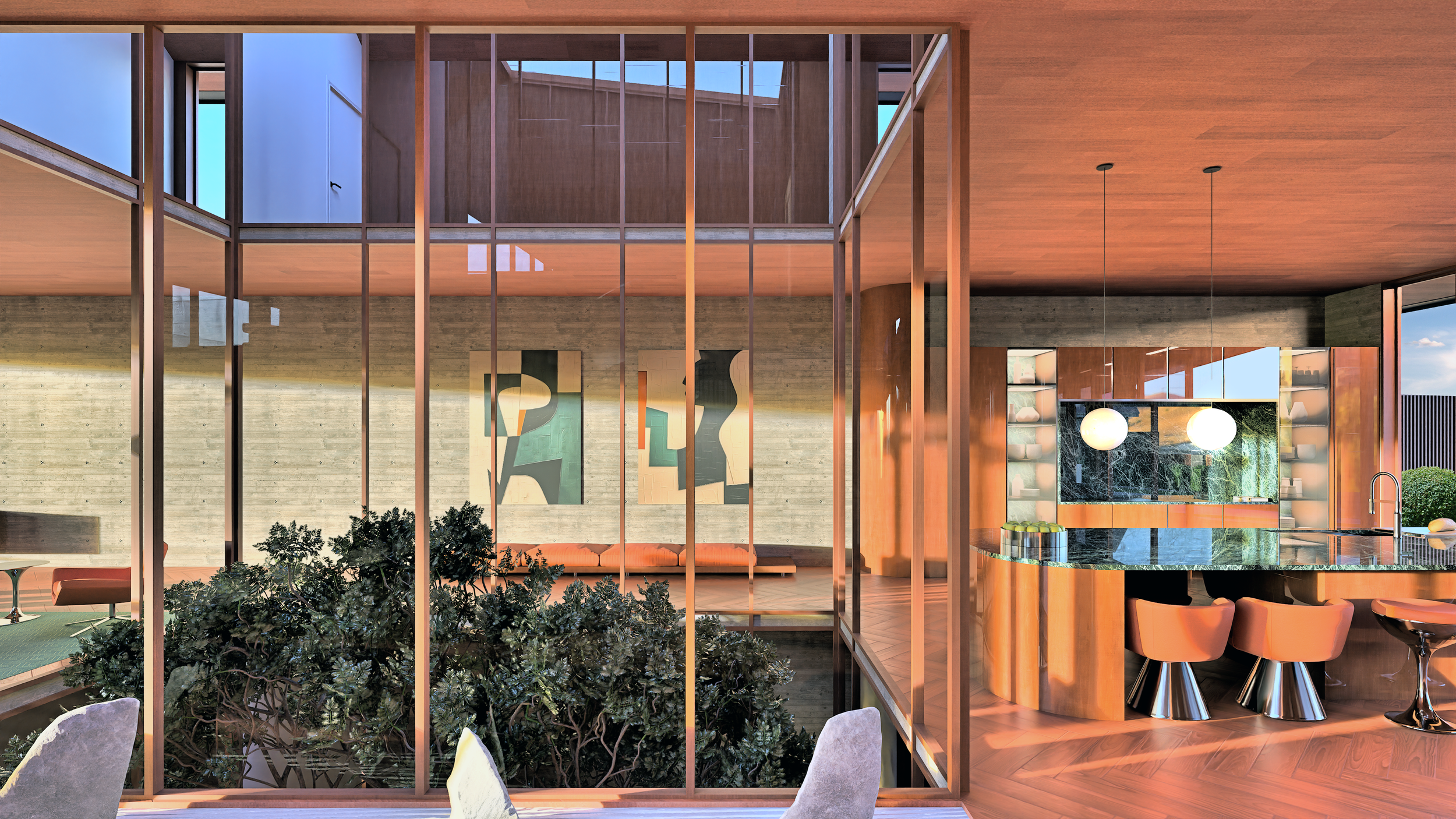 Anchored in the richness of mahogany wood and infused with the playful optimism of the 1960s, Modora embraces a bold design language that is both nostalgic and forward-looking. Its interiors unfold around three dramatic light wells that cascade daylight through every floor, illuminating a diverse program of spaces — from a grand ceremonial hall to a private cinema, game room, gym, and bar.